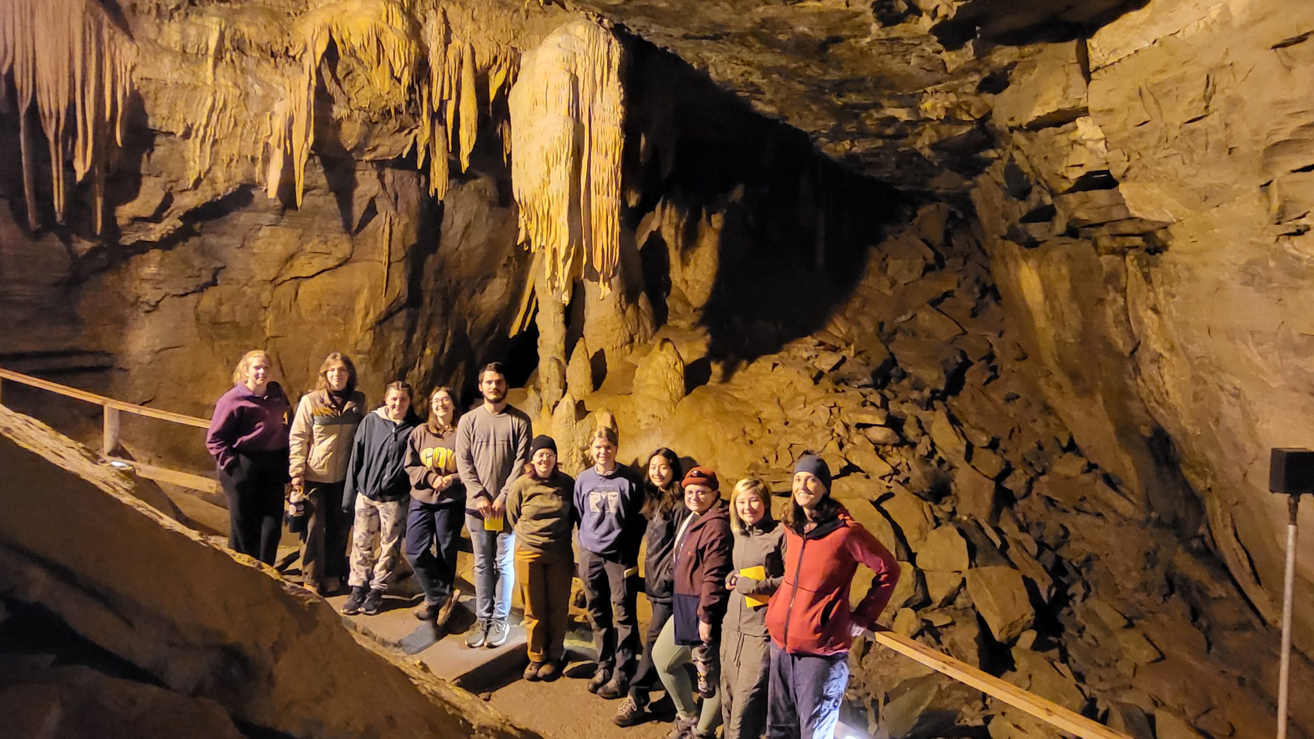 To warm up, we visited the Lost World Caverns commercial cave outside Lewisburg. Paths were well-established, and speleothems were well-lit, making it easy to pose the class in front of photogenic stalagmites. From left to right: Ripley and Jada (experienced cavers, and our guides for the trip from OU), Alexa, Lauren, Hayden, Ryann, Laurel, Lilly, Lain, Li, and Lyon (lots of L names in this group!). Nick took the photo.