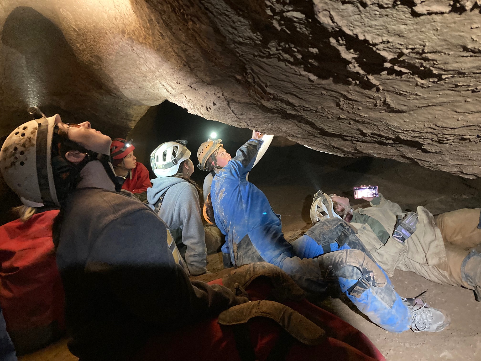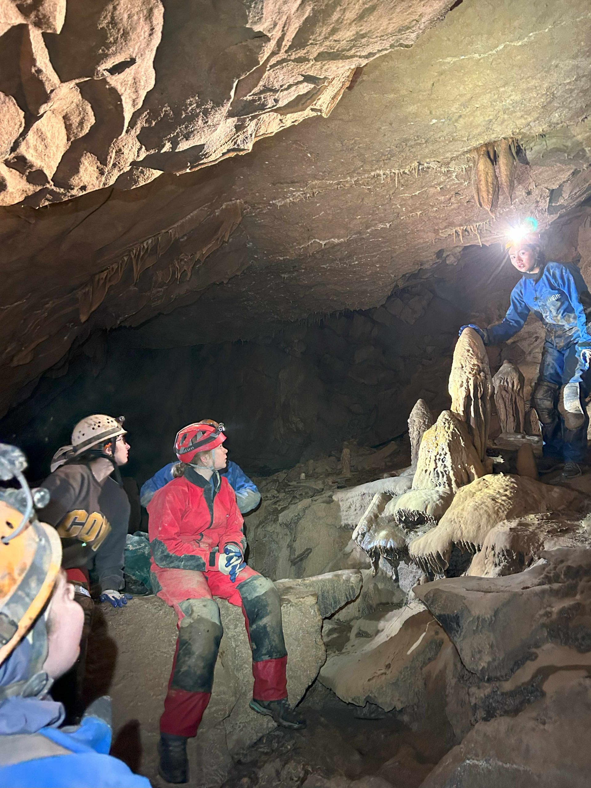 Lilly points out some stalagmites to Laurel and other COW students.
