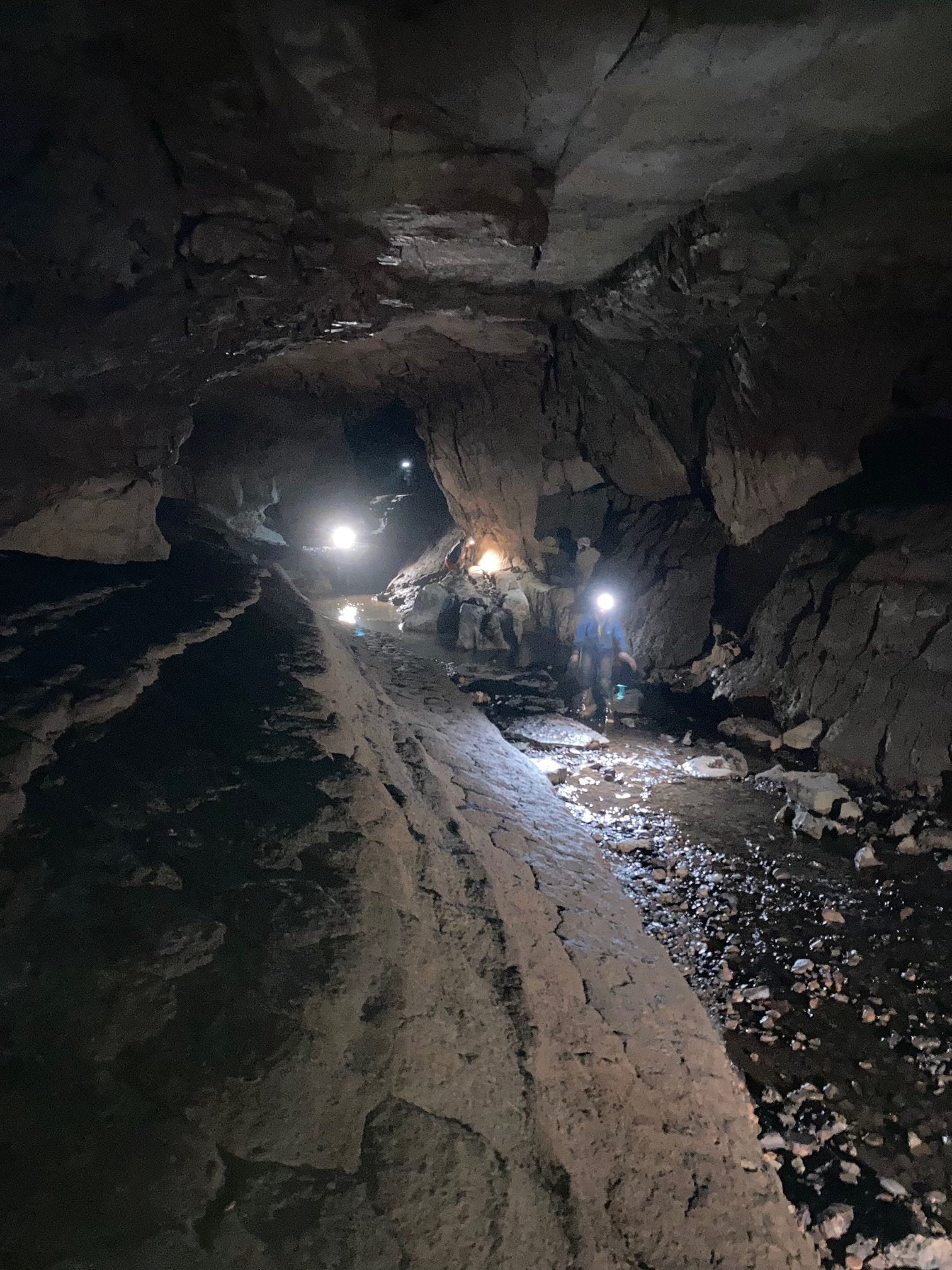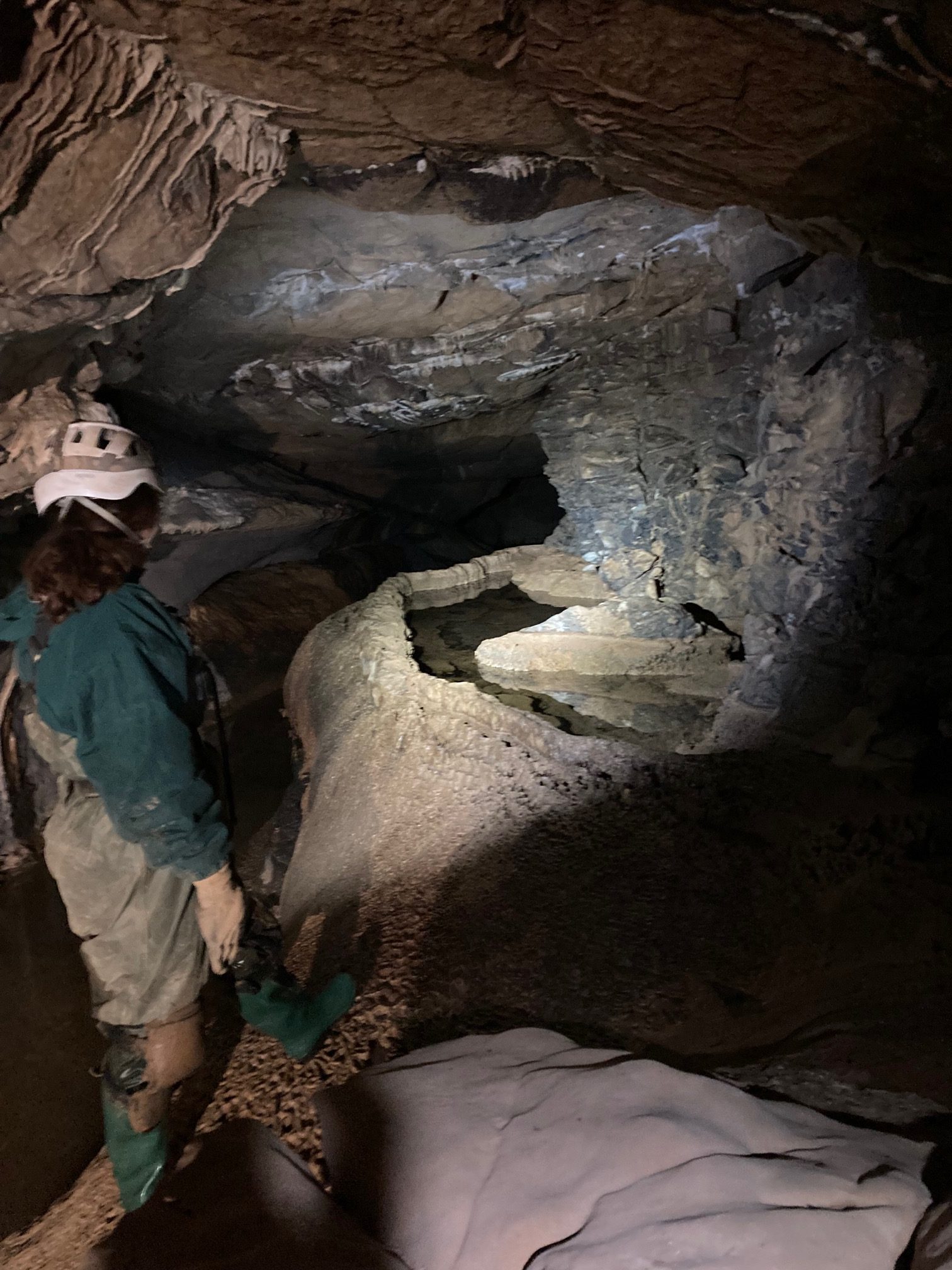 On our last morning, we entered Buckeye Creek Cave, which we were warned was a wet cave. Understatement of the year. The cave follows the path of Buckeye Creek, which was flowing at a low-moderate discharge throughout. This made the path challenging, but navigable until we got to the sump, which is a nearly water-filled section of passage; we would have had to crawl through stinky muck to traverse this section, so we opted to turn around instead. The right photo shows Alexa shining a light on a rimstone dam.