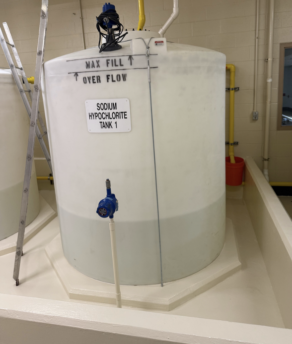 Figure 5. One of three tanks that hold chemical solutions that are added to the water to purify it; this tank holds sodium hypochlorite.