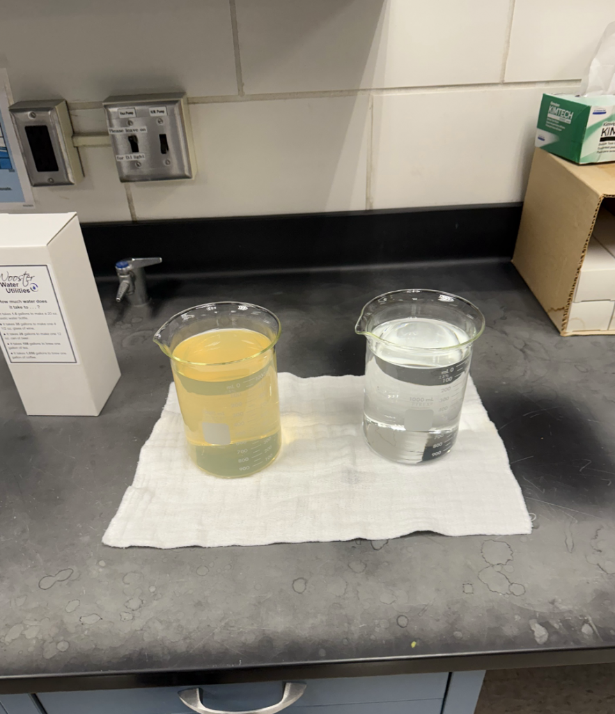 Mr. Sigler shared many different water treatment processes, but at the very end, we were shown two containers of water (Figure 2). The lab technician said, if we couldn’t retain anything from the hour-long tour, we should at least take home the following message. The water on the left is the water being pumped out of the ground, and the water on the right is the clean, treated water being distributed to the residents of Wooster.