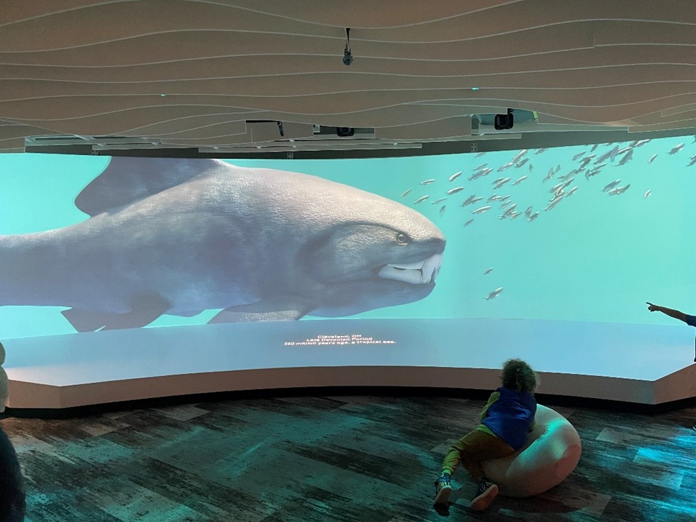 Figure 3. An immersive animated exhibit that brings the prehistoric oceans to life, showcasing ancient predator and prey relationships. It cycles through numerous facts about our favorite fossil fish, Dunkleosteus!