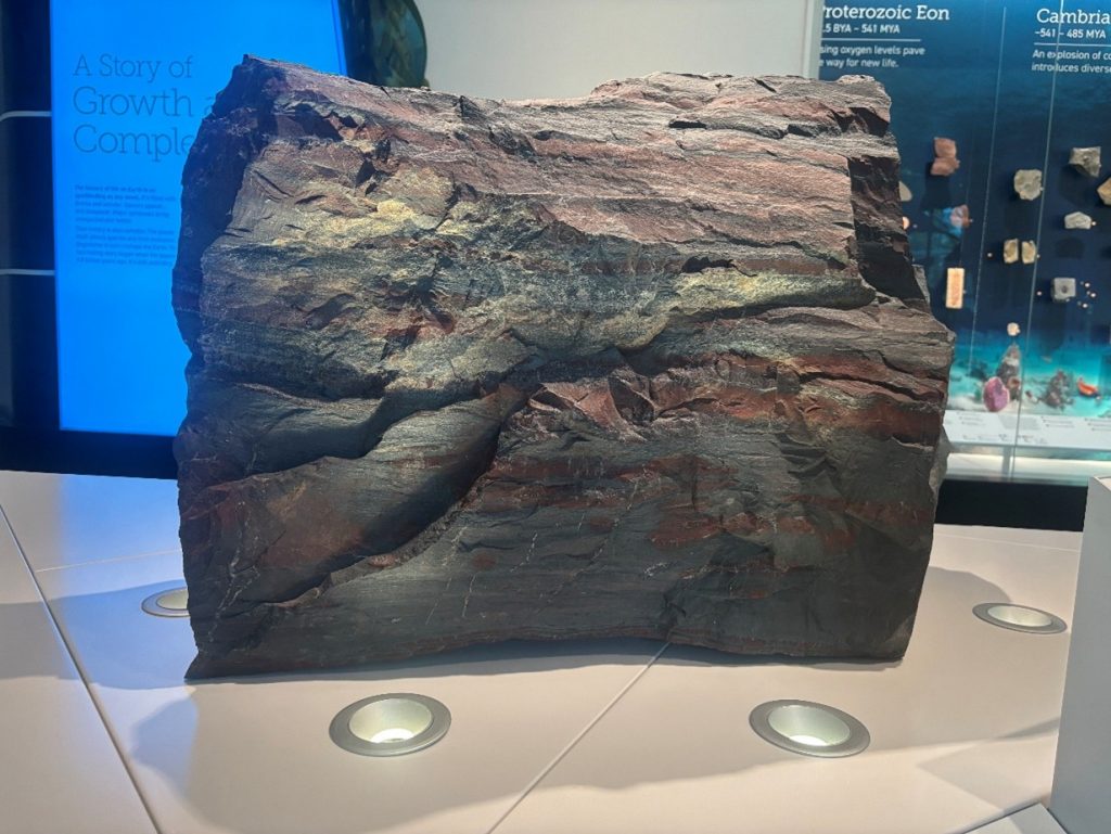 This exhibit provided details on local paleogeography, and the map specifically allowed viewers to connect with places they are familiar with. The display uses vibrant color and intentionally well-placed labeling which draws people in. This is a great inspiration for our own wall art and display design!