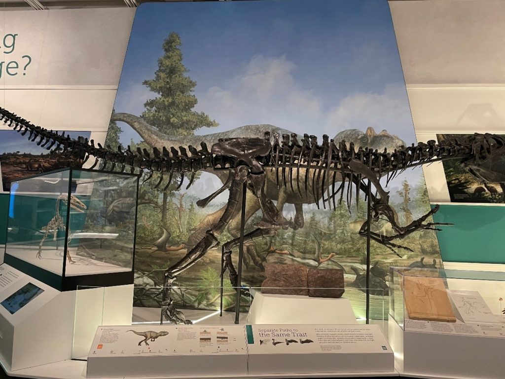 Figure 5. A display featuring a dinosaur fossil and trace fossil footprints, along with paleoart in the background.