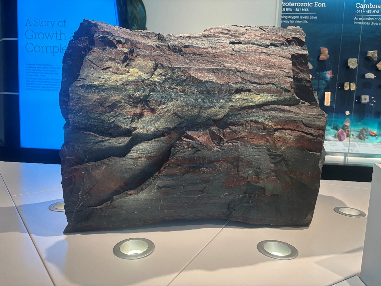 This exhibit provided details on local paleogeography, and the map specifically allowed viewers to connect with places they are familiar with. The display uses vibrant color and intentionally well-placed labeling which draws people in. This is a great inspiration for our own wall art and display design!